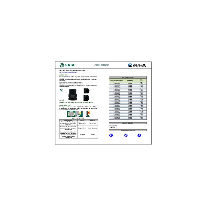 Fabricado en Acero Cr-Mo, forjado en frio para mayor resistencia al impacto. Acabado fosfatado negro para mayor protección de la oxidación y corrosión. Estampada en laser para mayor categoria.Ideal para usar en herramientas de impacto. Tecnología Surface Drive®, protege la arista del tornillo y la planitud de la herramienta.