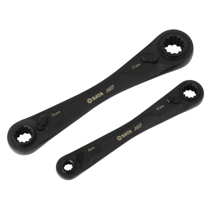 Este juego SATA® incluye dos llaves de trinquete con palanca de reversión incorporada, permitiendo cambiar la dirección de apriete sin necesidad de retirar la llave del tornillo. Cada llave ofrece dos tamaños, proporcionando versatilidad en diversas aplicaciones. El vástago ergonómico permite aplicar más torque, facilitando el trabajo en espacios reducidos.