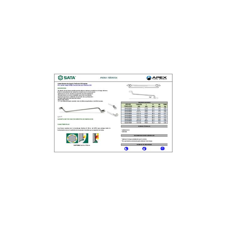 Llave corona de ángulo profundo en milímetros. El diseño de las llaves estrella permite diluir el esfuerzo mecánico a lo largo del arco. Evita la concentración de esfuerzos mecánicos en un solo punto. Aleación en cromo vanadio que permite una alta resistencia. Recubrimiento en cromo niquelado que evita la oxidación. Temple adicional en la boca de la llave. 70° de inclinación para acceder a los tornillos empotrados o de difícil acceso. GARANTIA DE POR VIDA POR DEFECTOS DE FABRICACIÓN. Las llaves cuentan con la tecnología Surface ® Drive de SATA que protege tanto la herramienta como el cuadrante de las piezas roscadas.